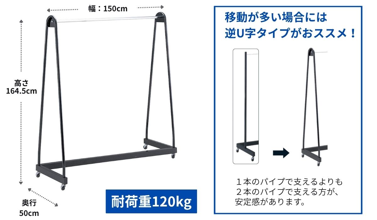 ■支柱を2本のパイプで支えるので、移動時も安定感のあるハンガーラックです。