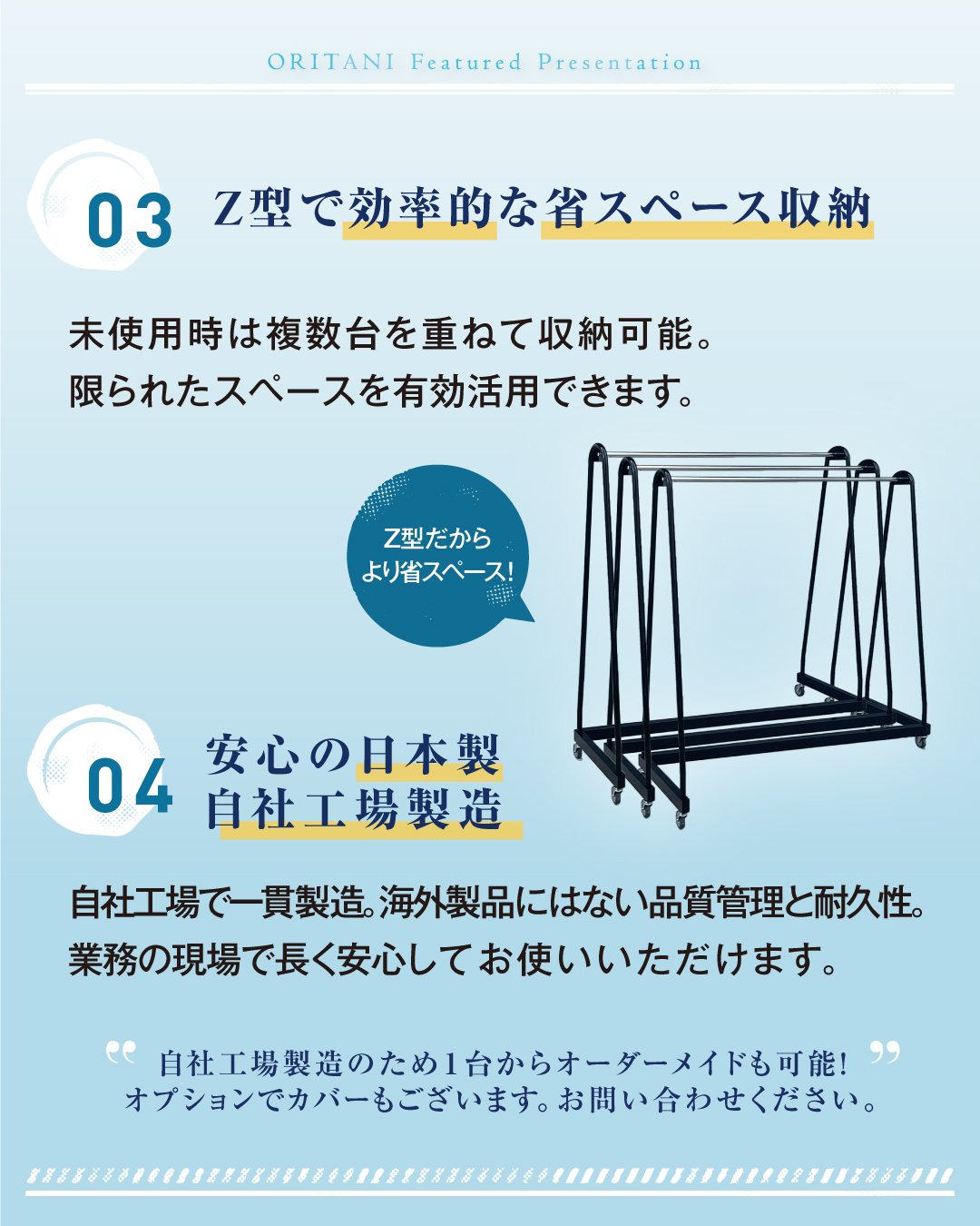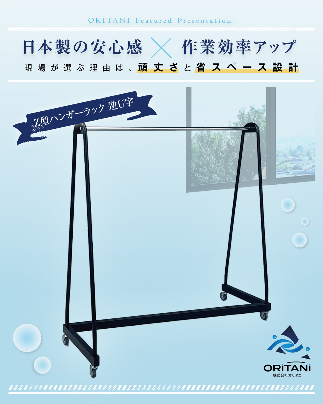オリタニハンガーラックZ型逆U字は日本国内本社自社工場で製造しております。